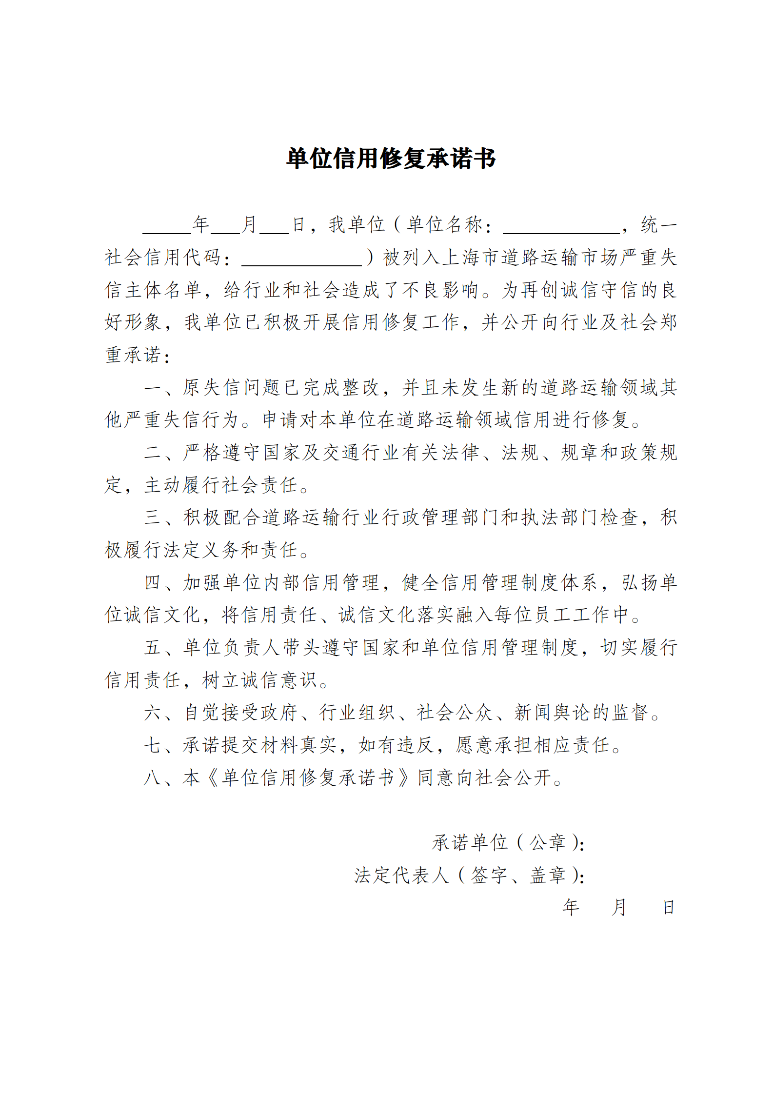 (一)提出申请。申请人向认定部门提交《上海市道路运输市场信用修复申请表》(附件1)和《信用修复承诺书》(附件2、3)。