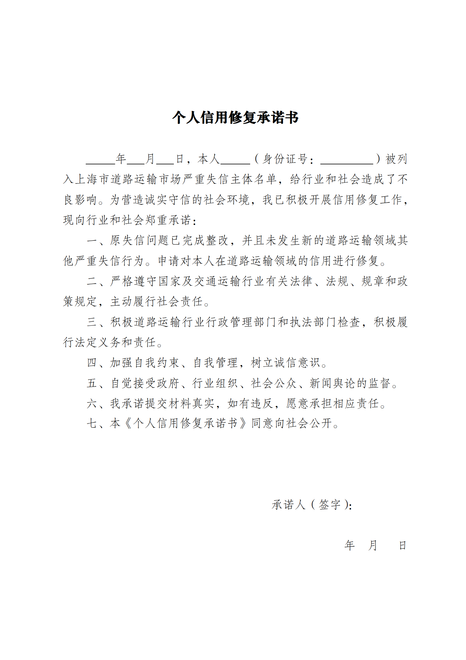 (五)修复处理。认定部门根据修复决定,于5个工作日内在“上海交通信用平台”中更新严重失信状态为“已修复”,并通过数据对接从“上海市公共信用信息服务平台”等其他信用平台中撤下失信信息的对外公示。同时,认定部门及时在相关网站上公布信用修复名单和《信用修复承诺书》,其中《个人信用修复承诺书》应隐去隐私信息,公布时间与原认定发布的严重失信名单期限一致。
